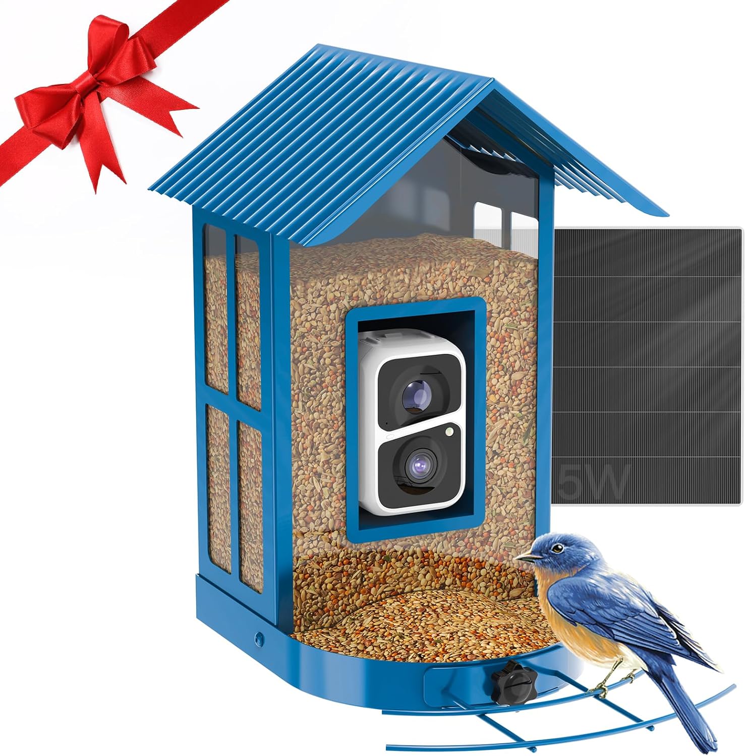 SOLIOM Comedero para pájaros con cámara inalámbrica para exteriores, cámara de alimentación de pájaros con IA para identificar especies de aves, grabación automática de video de aves y notificarte, panel solar de 5 W, IP65 resistente a la intemperie, carcasa de metal BF08 (azul)